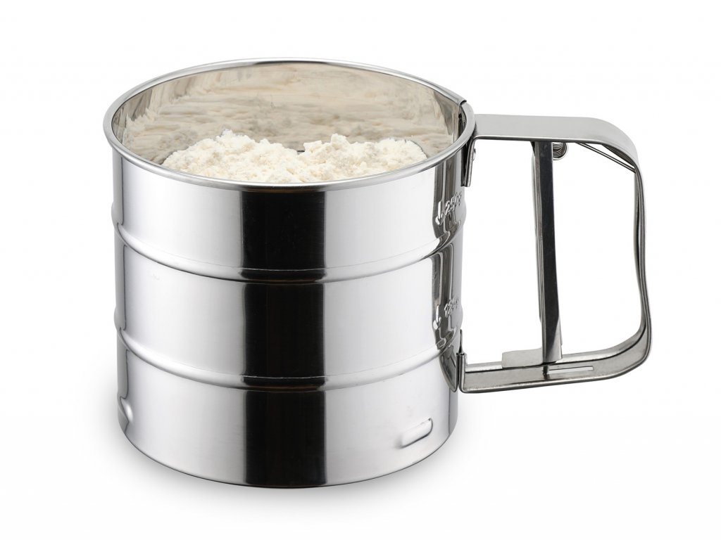 - nad sítem je umístěna speciální vrtule, která se roztočí stisknutím páky v rukojeti, a tím dochází k prosívání mouky nebo moučkového cukru