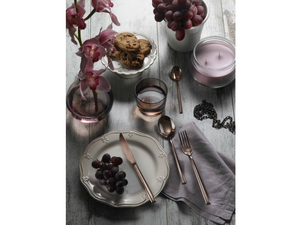 Příbory Synthesis Treasure Bronze jsou nejen funkční, ale i estetickým klenotem pro váš stůl. Díky špičkovým technologiím je povrch ošetřen PVD povlakem, který zajišťuje výjimečnou tvrdost a odolnost, aniž by ovlivnil lesk nebo bezpečnost pro kontakt s potravinami. Tato kolekce přináší harmonii mezi tradicí, elegancí a moderním zpracováním.