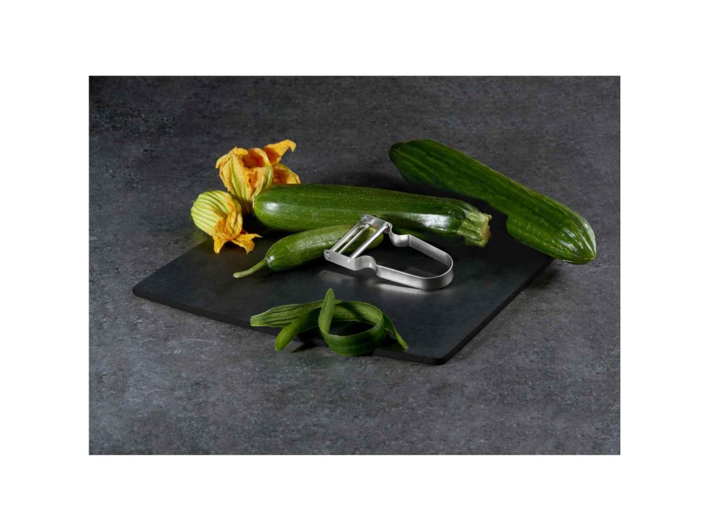 Lehká hliníková rukojeť dobře padne do ruky a umožní pohodlnou práci i při větším množství surovin. Boční integrované očko navíc usnadní odstranění drobných kazů ze zeleniny. Celková délka škrabky je 11 cm – ideální velikost do každé kuchyně.